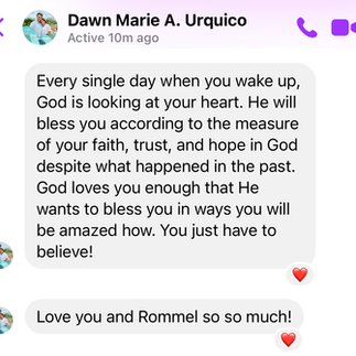"Thank you" is an understatement of what I really want to say to all the people who reached out to comfort us and to be with us in this season of our life. I pray that all of us will grow closer to God and be able to say what Job said in chapter 42:5, “I have heard of You by the hearing of the ear; but now my eye sees You.” May our faith grow stronger like how this trial helped ours where I came to realize that: